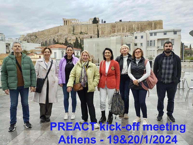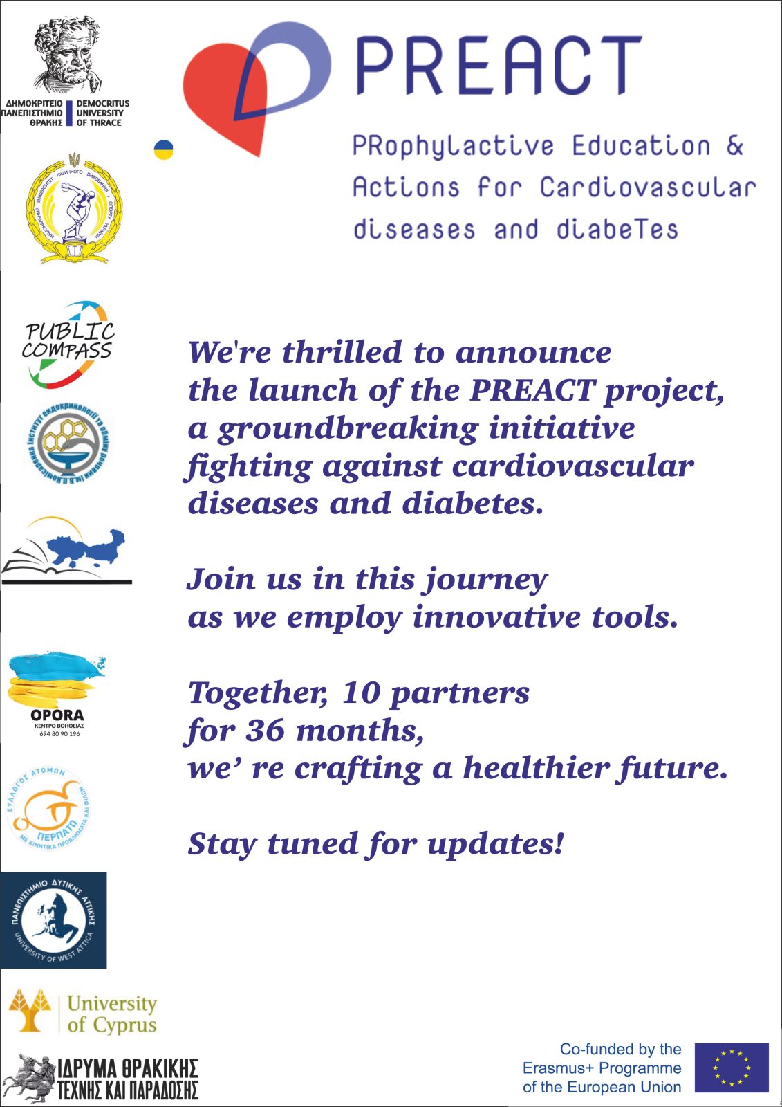 Πραγματοποιήθηκε στην Αθήνα, στις 19 και 20 Ιανουαρίου 2024, η εναρκτήρια συνάντηση του ευρωπαϊκού προγράμματος EU4-HEALTH: «Προληπτική Εκπαίδευση & Δράσεις για Καρδιαγγειακά Νοσήματα και Διαβήτη (PREACT)», με οικοδεσπότη το Πανεπιστήμιο Δυτικής Αττική. Κατά τη διάρκεια της συνάντησης οι συνεργαζόμενοι φορείς γνωρίστηκαν μεταξύ τους, παρουσίασαν τον οργανισμό τους και τη συνεισφορά τους στο σχέδιο. Η Public Compass προσέφερε στρατηγικές διάδοσης, ενώ η OPORA υποσχέθηκε υποστήριξη σε οικογένειες που πλήττονται από καρδιαγγειακά νοσήματα και διαβήτη. Η Περιφερειακή Διεύθυνση Πρωτοβάθμιας και Δευτεροβάθμιας Εκπαίδευσης Ανατολικής Μακεδονίας - Θράκης δεσμεύτηκε για εκτεταμένες προσπάθειες διάδοσης στους 70.000 μαθητές της. Το ΠΕΡΠΑΤΩ και το Ίδρυμα Θρακικής Τέχνης και Παράδοσης έδωσαν έμφαση στην προσέγγιση των περιθωριοποιημένων κοινοτήτων. Πανεπιστήμια όπως το Δημόκριτο και το Εθνικό Πανεπιστήμιο της Ουκρανίας αποτελούν τους ειδικούς στην άσκηση και τη φυσικοθεραπεία, αντίστοιχα. Στη συνάντηση, που συντονίστηκε από το Δημοκρίτειο Πανεπιστήμιο Θράκης, διασαφηνίστηκαν οι στόχοι του σχεδίου και οι πτυχές διαχείρισης και η κατανομή εργασιών. Βασικά σημεία εστίασης αποτέλεσαν οι κανόνες χρηματοδότησης και το σχέδιο διάδοσης, συμπεριλαμβανομένων των διαδικτυακών πλατφορμών και των εκστρατειών στα μέσα κοινωνικής δικτύωσης.